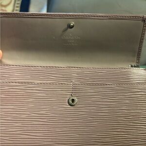 Callouts has black smudge inside under flap. Color is like a dark beige , taupe color. Looks different indifferent lights. Outside of wallet pristine. Corners look good minor wear. Corners inside are tight date code may be worn out but heat stamp vibrant