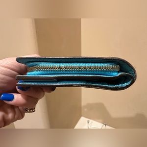 LIMITED EDITION "GROOM" Louis Vuitton compact monogram zip Wallet with blue interior. It's in used condition. call out on this gorgeous piece is wear from used to the painting of the bellboy and stripes. Interior is in used condition with some discoloration apparent as pictured. Discoloration on coin pouch. snap and zipper in excellent working condition.