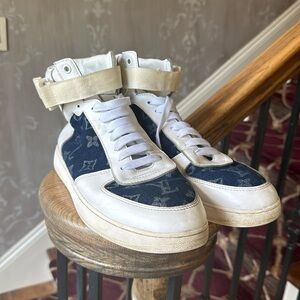 Louis Vuitton men’s high top sneaker, ankles, adjustable strap size 9 1/2 signature denim print leather preowned Preloved good condition. The ankle strap is adjustable with Velcro for a better fit.