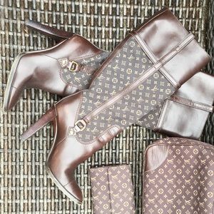 Louis Vuitton mini lin high heel boots, size 37 1/2. In good used condition. Has some scratches through out boots. See all pics, ask questions, yes they are authentic. Great head turner!