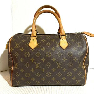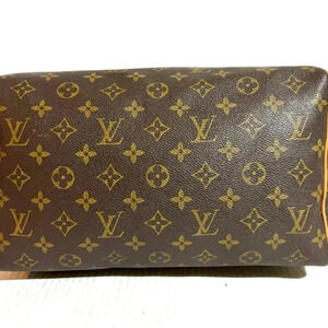 Louis Vuitton monogram speedy vintage brown coated canvas LV top handle bag with brass hardware rolled handles leather trim embellishment canvas lining & single interior pocket zip closure at top strap have some stains corner have minor tear hight 9.5” width 11” depth 6.5” strap drop 4”The dimensions are based on approximately measurements before placing an order please check take a moment to view all photos using feature for a closer look The dimensions are based on approximately measurements before placing an order please check take a moment to view all photos using feature for a closer look