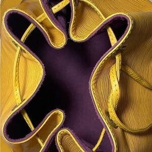 Louis Vuitton Petit Noe Epi Leather with a drawstring closure Beautiful yellow epi leather exterior with a clean purple suave interior. Call outs cracking on the side of the handle and minor rubbing on corners. Any questions feel free to ask