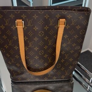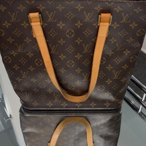 Signature Louis Vuitton pattern and canvas, dual flat leather shoulder straps, brass-tone hardware, open top, large interior snap closure pocket, single interior zip pocket, large open pocket