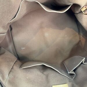 Brown coated canvas, signature Louis Vuitton monogram, brass hardware, leather trim, rolled adjustable shoulder straps, protective feet at base, top zip, brown canvas interior, three open pockets, single keychain attachment