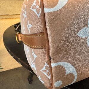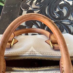 LV speedy 25 bandoulier from the by the pool collection in mist colorway. I bought this on eBay probably last year and I love it but this bag is just not big enough. I did not get the charm,or keys to the lock or dust bag. Will come with lock and bandoulier strap. The bag itself is in good condition, the canvas has no issues or discoloration, the vachetta is in good condition with normal wear and tear, no excessive darkening on strap but there is some darkening on the handles and by where the extra straps hardware touch the leather, no exposed piping but there is a spot on the under side of the bag on the piping. The interior is heavily stained from previous owner and could use a cleaning but it does not take away from its functionality and has no odor in the interior. This bag was authenticated by eBay