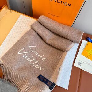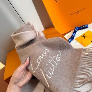 Indulge in sophistication with this gorgeous Louis Vuitton scarf. In a soft taupe hue, it features elegant "Louis Vuitton" script embroidery. Crafted from plush, high-quality fabric, it offers both warmth and timeless style. Fringed edges add a chic touch, and it comes with iconic LV packaging—perfect for gifting or elevating your own wardrobe. A must-have for luxury lovers!