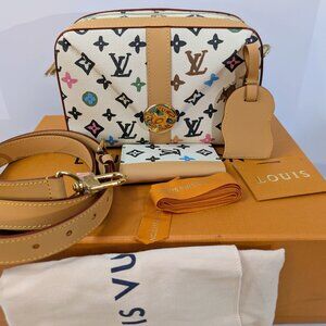 This highly collectible Louis Vuitton bag is the Monogram Craggy Envelope Shoulder Bag, a key piece from the celebrated Tyler The Creator collaboration. The bag is crafted from white coated canvas featuring a unique, hand-drawn "Craggy" Monogram in multi-colors and whimsical figures. Its structured, envelope-style silhouette is accented with natural Vachetta leather trim and a central snap closure, making it a charming and instantly recognizable piece. The bag includes a matching, adjustable Vachetta leather strap and luggage tag, securing its status as a rare and sophisticated accessory. It is in new without tags condition and comes with everything pictured: Louis Vuitton strap, luggage tag, matching wallet, dustbag and box. Tyler the Creator approved.