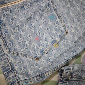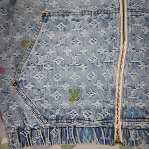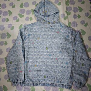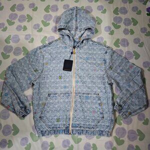 Gold-tone zipper, kangaroo pocket, hoodie design.