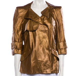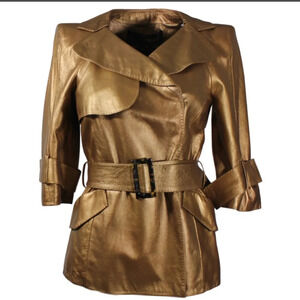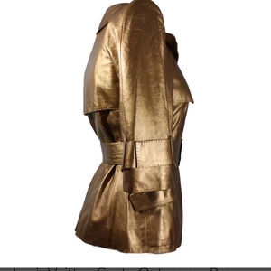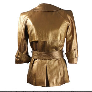 Mini trench in bronze lamb leather, 3/4 sleeves. black monogrammed silk lining. Button closure pressure, very chic and modern with epaulettes. Two flap pockets. Value Shop $3,999. Unbelted