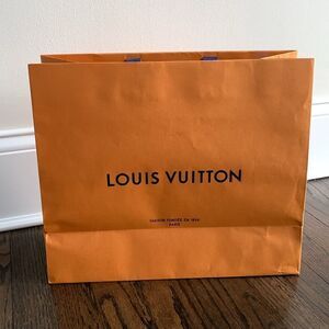 TAGS: louis vuitton shopping bag, authentic LV gift bag, orange designer tote, branded luxury packaging, empty louis vuitton bag, blue handle LV tote, upscale closet storage, fashion prop bag, LV orange paper bag, parisian style packaging