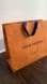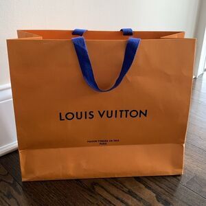 TAGS: louis vuitton shopping bag, orange LV gift bag, authentic LV packaging, empty louis vuitton bag, luxury gift presentation, branded fashion prop, closet storage bag, LV bag with blue handles, upscale gift wrap, designer paper tote