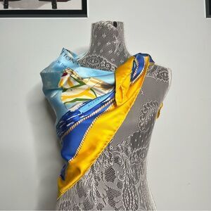 Beautiful limited edition scarf by Louis Vuitton. Very hard to find from the Louis Vuitton LV cup line. Edition challenger for the races. Features the various boats that were in the race. Great preowned condition, I do not notice any particular flaws but may have tiny marks from gentle use. Tag still attached. 100% silk. Measurements approx 34” x 32”.