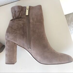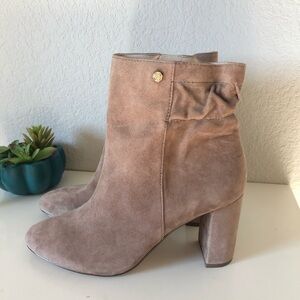 A smooth suede boot exemplifies elegance in simplicity with its graceful almond toe and wrapped block heel, and a ruched topline for a touch of textural intrigue. Size 7.5. Previously worn in great condition. Minor scuffs on suede most all wear on soles. No box.