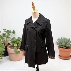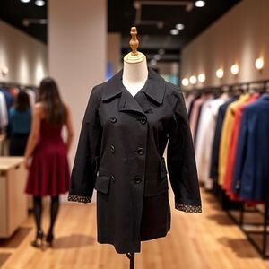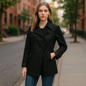 Sophisticated black trench with double-breasted front. Stylish cuff details. Perfect for a refined look.