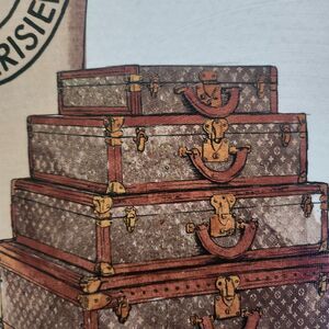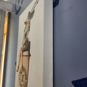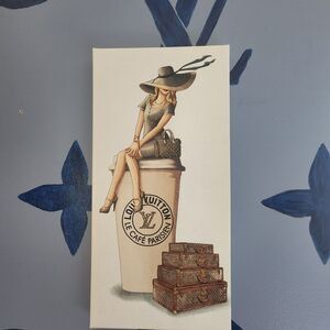 Chic Louis Vuitton illustration on canvas featuring a stylish figure on a coffee cup. Includes iconic Louis Vuitton branding and luggage. size 12x20 could be hung in a dressing room, closet, or bedroom.