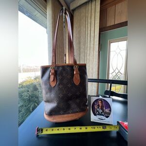 This LV Bucket Bag is in very good condition. It has just returned from Louis Vuitton where it was repaired with a new lining and chain. The bag is in amazing shape.