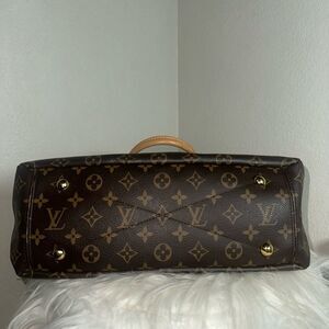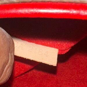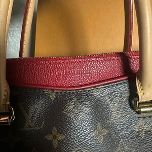 Stylish Louis Vuitton satchel with iconic monogram. Features rich brown and vibrant red accents. Perfect for any occasion.