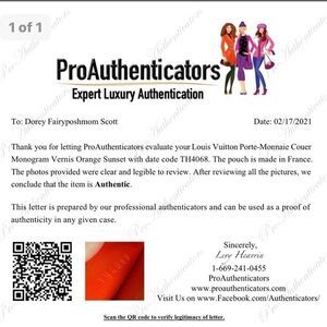 This authentic Louis Vuitton Poret-Monnaie Couer Monogram Vernis Orange Sunset heart-shaped coin purse is in virtually new condition. Please note that the official color is Orange Sunset. However, it looks red to me. It comes with its chain and heart LV charm.