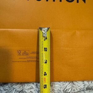 Orange shopping bag with blue handles. Features Louis Vuitton branding.