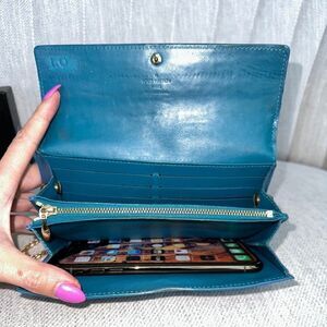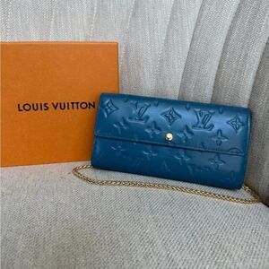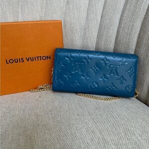 This is a preloved *verified* authentic Louis Vuitton Monogram Blue Vernis reade crossbody wallet paired with removable offmarket chain. Auth cert incl. Serial & logo in pics. Exterior leather dyed and sealed w/ protectant. All working hardware (buttons, zippers). Other minor imperfections exist (ie - coin stains in pouch, minor tarnish & scratches on hardware, initials imprint exists. Fits iPhone 14 and 14 pro!! Comes with non-LV bag and box. pet & smoke free home