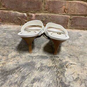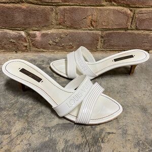 These slides from Louis Vuitton are one of a kind in trendy women's footwear. These white sandals are perfect for a casual day out or brunch with friends. Crafted from patent leather, they are styled with open toes, have perforated logo details on the uppers and 2” heels. They are finished with leather soles.
