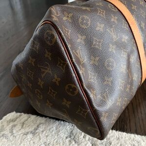 Gorgeous Louis Vuitton keepall 45. Perfect travel bag. Good preowned condition. Does show some areas of discoloration to leather as shown and as expected from a vintage bag. Gentle scuffing to canvas. Also one small scuff in canvas as shown. Date code sp0962. Comes with luggage tag