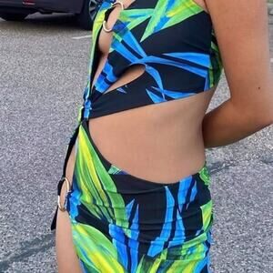 keywords: tropical, vacation, summer, spring, designer, stretchy, cover up, swim cover up, leaf graphic print, abstract, sleeveless, cruise, boat, yacht party, beach party, lightweight, bright, neon, celebrity, celeb style