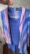 Open front jacket/duster in a watercolor swirl in shades of light purple, blues, and pinks. Jacket is single layer 100% silk chiffon - so lightweight that it could be tied as a scarf.
