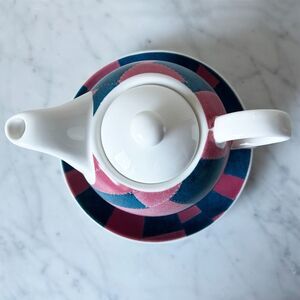 Louise Bourgeois Tea for One set. This wonderfully-designed tea set includes a teapot and lid, tea cup and saucer all nestled together in a lovely display. It references the designer's daily ritual of starting every day with plenty of tea, sugar and jam. The imagery on this four-piece tea set for one is from Louise Bourgeois' fabric book Ode a l'oubli, featuring collages made from fragments of her old clothing and household items. Bone China, dishwasher safe. Gift boxed, a tea lover's ultimate companion. Teapot measures 4-1/2" x 6-1/2" x 4-1/2", Cup 5-1/4" x 2", Saucer 6-1/2" Produced by Third Drawer Down Studio, Australia in collaboration with Louise Bourgeois' studio, The Easton Foundation. Enclosed card is creased, shown in photo.