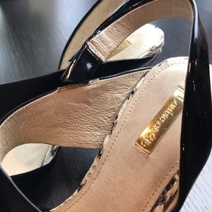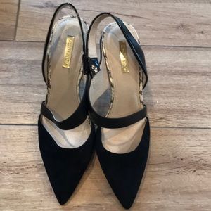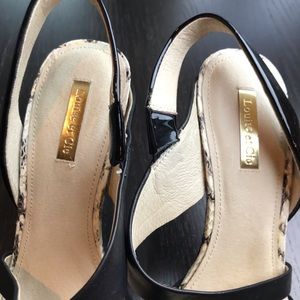 A gorgeous black sling back with a mix of suede, patent leather and an embossed snakeskin print. Minor signs of wear on the top of the outer sole. Excellent preowned condition. The heel measures approx. 4”