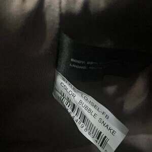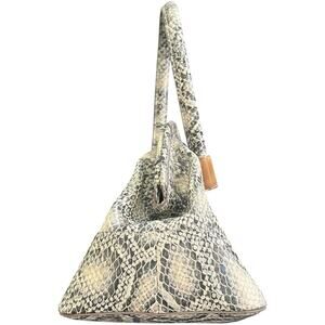 The unique domed silhouette of this mini bag is topped with an asymmetrical top strap that twists from back to front. Magnetic top frame closure. Embossed snake print.