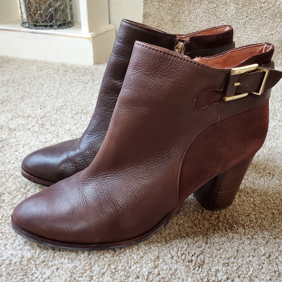 Great condition Louise Et Cie womens booties. Brown leather and suede. Zip closure. Gokd buckle detailing. Heel height 3". Womens size 9