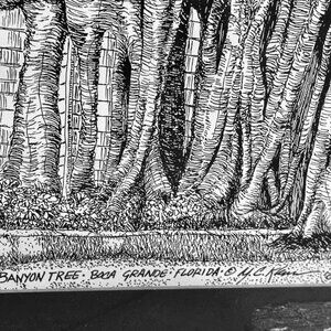 This is a beautiful representation of an historic banyan tree on Gasparilla Island, Florida, in the town of Boca Grande. Called “The Octopus Tree,” its tentacles have intertwined with Gilchrist Avenue since it was part of the du Pont Crowninshield compound in the early 1900s. It will need to be reframed, as it went through a hurricane and came out on the other side with a small piece of the glass taken out. It is approximately 16 X 20 and the artist is M.C. Klein.