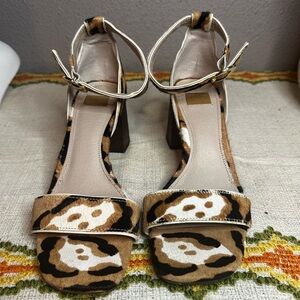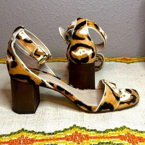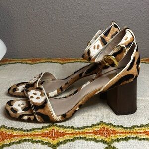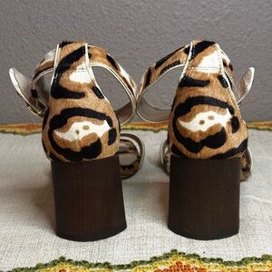 These sandals are pre-owned and in great condition. They feature real cow fur, gold hardware. Wooden heels measures 2.5 inches.