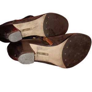 strap and buckle detail, gold tone hardware, inside zipper, 3 inch stacked heel