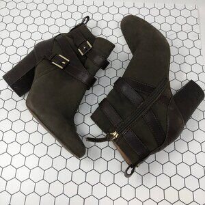 Louise et Cie Brown Leather Seneca Ankle Booties 8.5. I feel like the brown has a bit of an olive green tint to it. Strap and buckle detail. Size zip. Stacked wood block heel. Used condition. Please see photos.