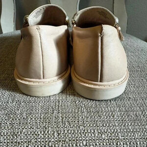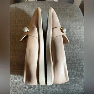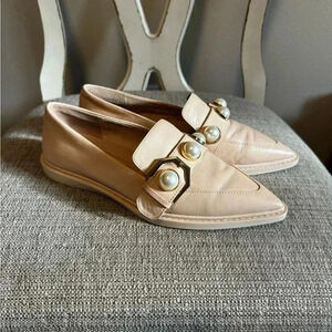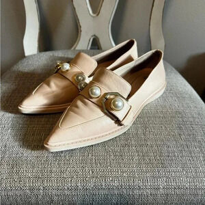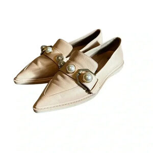 These are so cute and trendy right now. They’re a pale pink color. Pearly beads and geometric hardware create a polished effect on this pointed-toe loafer. In great shape, minimal discoloration on soles and no damage.