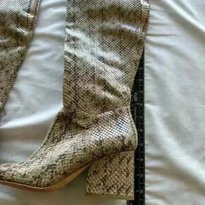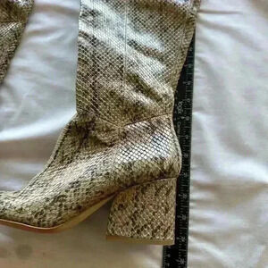 Louise et Cie over-the-knee boots in a stylish brown watersnake print, These boots feature a block heel and a pointed toe, with a sophisticated textured pattern that adds a unique touch to any outfit. The boots appear to be in excellent condition, ready to elevate your wardrobe.