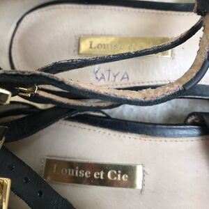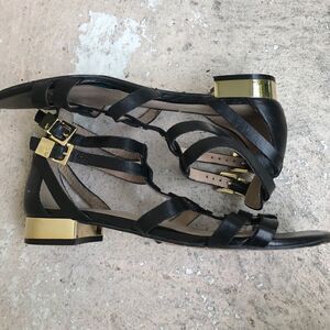 Beautiful black leather sandals with gold accents, gold heels are in very good condition that one has a tiny little Mark. Also little ones know that their names are supposed to be in their shoes so they put mommy's name in the shoe for her. I will try to get it out. Please look at pictures