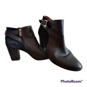 A wide swath of smooth leather wraps around the almond-shaped toe of a chic, wearable bootie and is secured at the side by a polished gold-tone buckle.