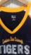 Eye-catching short sleeve T-shirt featuring the Louisiana State University Tigers. This spirited tee showcases the LSU Tigers logo and lettering on the front, set against a navy blue body with gold accents on the sleeves and collar. The design includes a V-neck and raglan-style sleeves, offering a sporty and comfortable fit. A tag at the hem indicates official LSU athletic department merchandise, adding to its appeal for fans and collectors alike. The shirt's overall construction and design make it a standout piece for showing team pride.