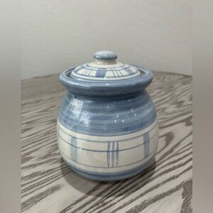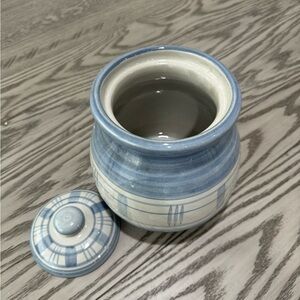 Lovely blue gingham cookie jar made by Louisville Stoneware as part of their Gaggle of Geese line