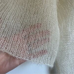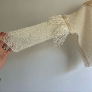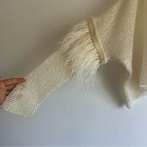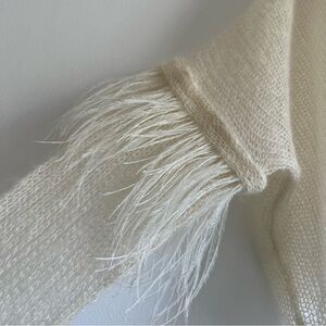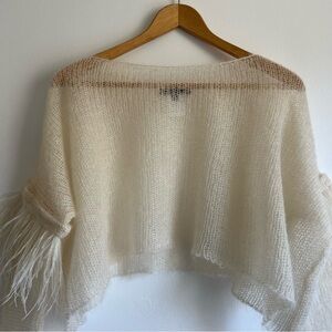 Oversized fit. Cropped silhouette. Dropped shoulders. Long, slim fitted sleeves with ostrich feather trim detail (the knit is stitched over the trim base which is thicker and of undisclosed material). Slightly bateau neckline. Unlined, semi-sheer. Lightweight, super fine and delicate blend knit fabric with stretch and light fuzz. 70% mohair, 30% silk. Made in USA. Dry clean only.