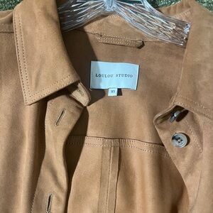 Shirt suede buttoned cuffs button fastenings through front supple, slightly stretchy suede mid-weight fabric hand wash or dry clean imported
