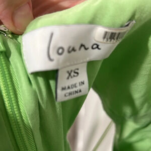 Green crepe (53% Viscose, 47% Rayon). Lining (100% Rayon). Hourglass. Sleeveless. Halter neck. Back zipper closure. 46.5" from shoulder to hemline. 20 3/4" slit. Imported