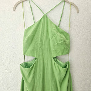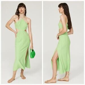 Louna Green Halter Cutout Midi Dress is a striking blend of elegance and bold style, perfect for making a statement. Featuring a chic halter neckline, this midi dress highlights a daring cutout at the waist that adds a touch of allure to its sophisticated design. The side slit enhances movement and adds a sultry flair, making it ideal for evening events or special occasions. Crafted in a flattering green shade, the dress in size medium hugs the figure in all the right places, offering both comfort and a sleek silhouette. This simple and sexy halter midi dress by Louna is the easy choice to look stunning on any formal occasion, wedding guest, party or dressed down with some sneakers or sandals for a more casual look.