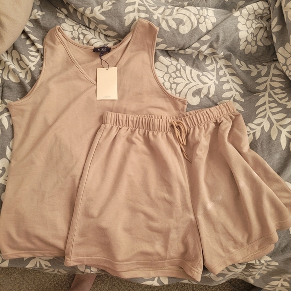 Soft French Terry taupe tank and shorts set. Perfect for lounging around! NWT, size S/M