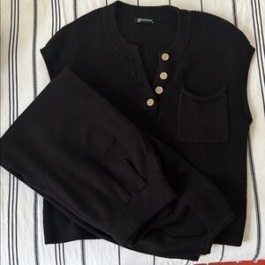 Knit pullover top and high waisted knot pants.