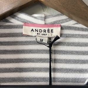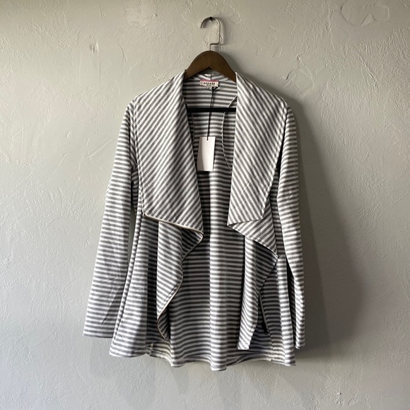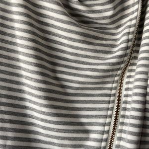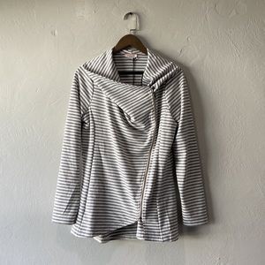 Gray and white striped lounge jacket. Shawl collar with asymmetrical zipper. Super comfy and cute!
