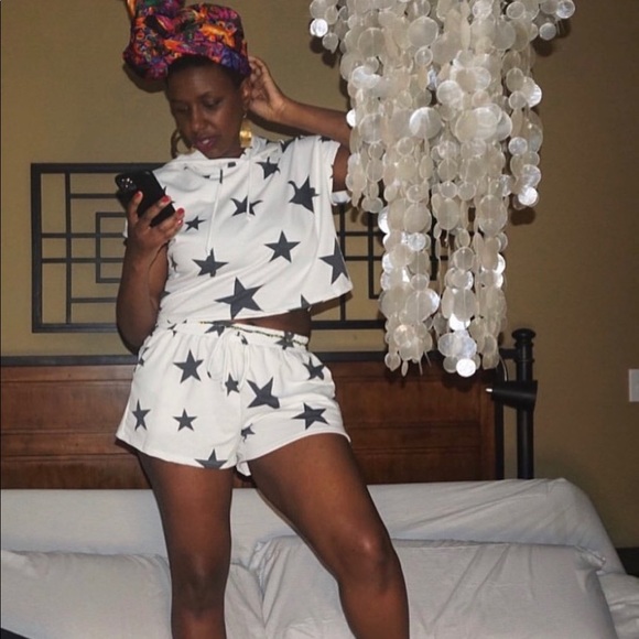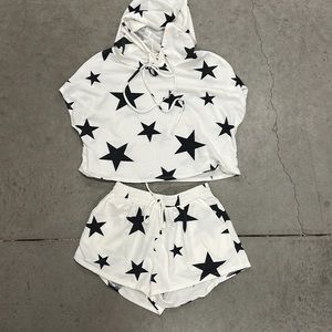 2 piece star print lounge set. Shorts have elastic waist with pockets. Top has drawstring hood. 63% polyester 34% rayon 3% spandex